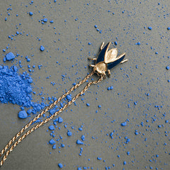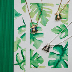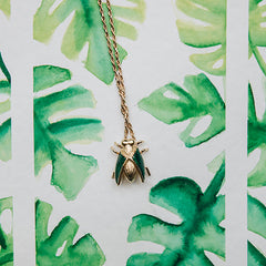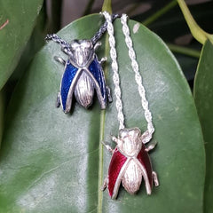 Long necklace with a fly-shaped pendant with enamel on its wings.